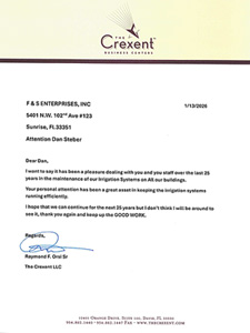 “Our firm has had the pleasure of working with Dan Steuber and his staff at F&S to service the irrigation systems of our properties for well over 20 years. Our firm manages over 1.8 million s/f of real estate in South Florida and it is without hesitation that I recommend their service.” – Ralph Merrit, Jr., President, Commercial Property Group, Inc., Doral, FL