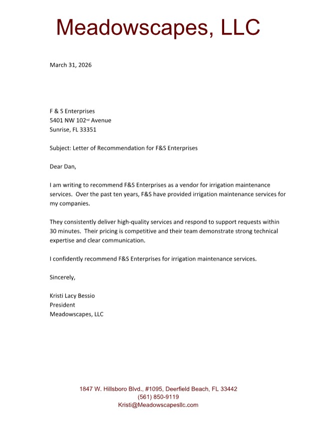 I am writing to recommend F&S Enterprises as a vendor for irrigation maintenance services. Over the past ten years, F&S have provided irrigation maintenance services for my companies.